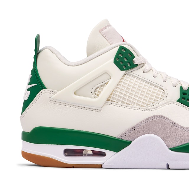 Air Jordan 4 Retro SB Pine Green to wyjątkowe sneakersy, które łączą w sobie klasyczny styl marki Air Jordan z charakterystycznymi elementami dla linii Nike SB. Buty bazują na połączeniu bieli z zielonymi wstawkami w odcieniu Pine Green, odznaczając sie unikalnym i uniwersalnym designem. Cholewka buta została wykonana z wysokiej jakości skóry, a szare nakładki z zamszu dopełniają wszystko w spójną i estetyczną całość. Zastosowanie innowacyjnych rozwiązań, takich jak specjalna podeszwa. Zapewnia lepszą przyczepność oraz podkreśla ich funkcjonalność i zastosowanie podczas jazdy na desce, jak i w codziennym użytkowaniu. Sneakersy wyposażone są w technologie Air-Sole, która zapewnia doskonałą amortyzacje i komfort przez cały dzień. Te buty to idealny wybór dla osób ceniących sobie unikalny styl z nutą elegancji, przez co są bardzo rozchwytywaną pozycją na rynku butów.